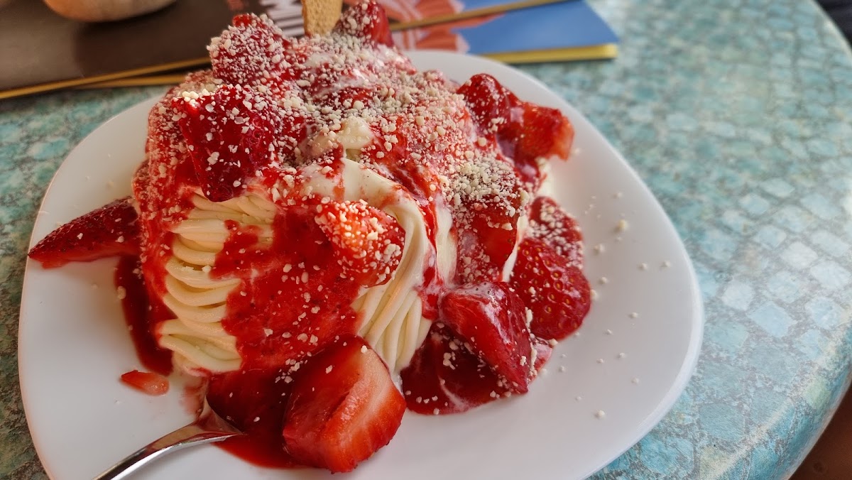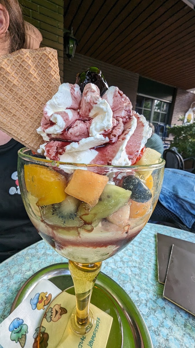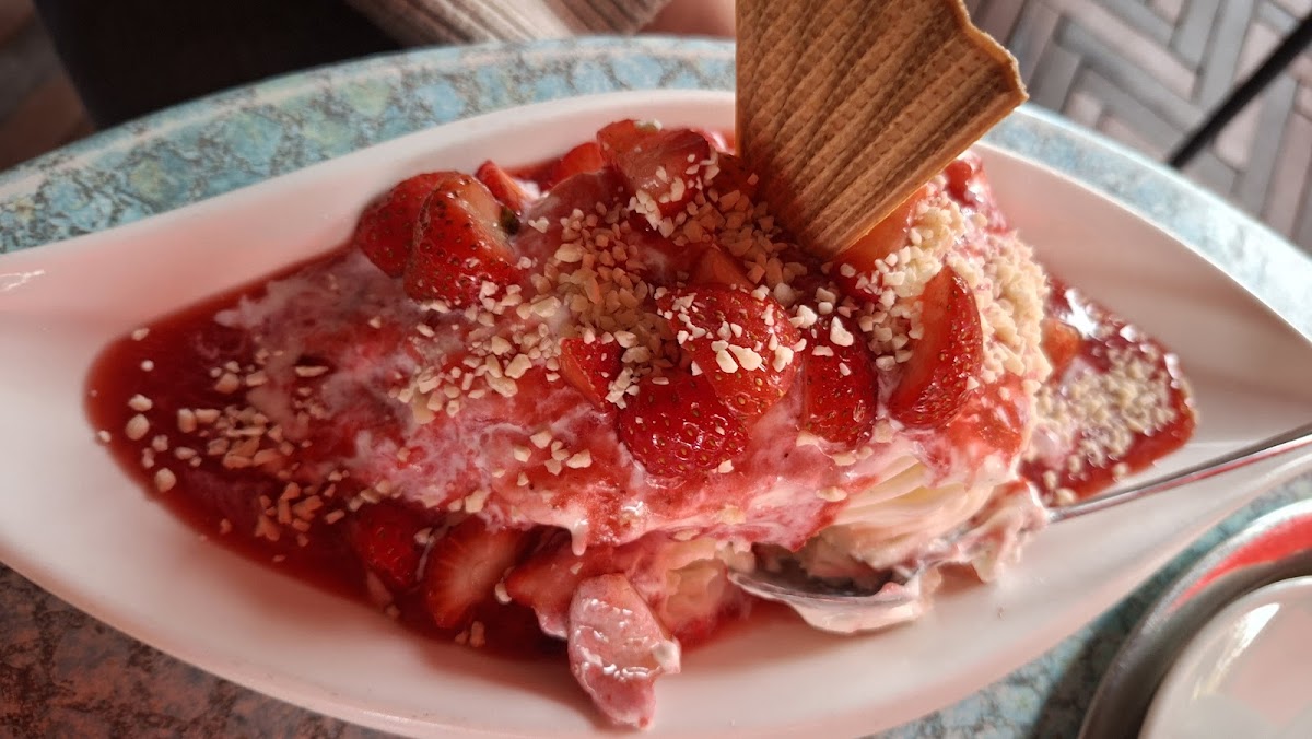 Another standout dish is the Früchtebecher, a fruity delight that brings together a colorful mix of fresh fruit and ice cream. If you're a fan of strawberries, you can’t miss the Erdbeerbecher-a sweet, strawberry-filled creation that perfectly complements the smooth texture of the ice cream. And for those who enjoy a fun twist on traditional flavors, the Spaghetti Eis mit Erdbeeren is a playful yet delicious option, featuring ice cream molded to look like spaghetti, topped with strawberries and a dusting of grated chocolate.